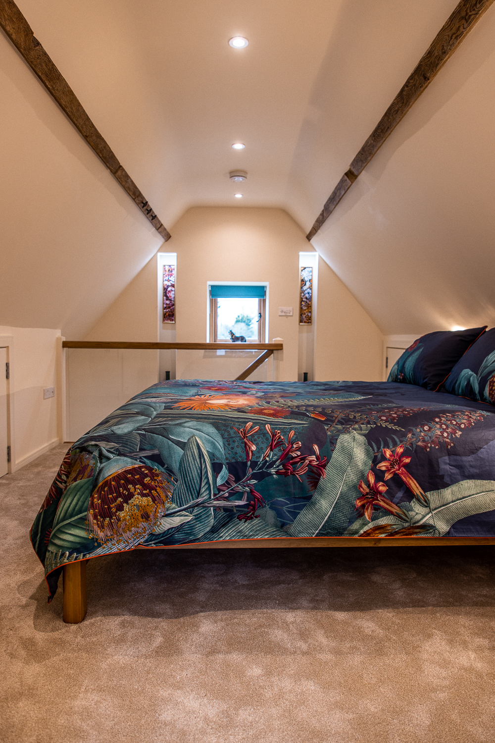 The Stable bedroom has a king sized bed, with Graham and Brown bedding and non-allergenic duvet and pillows.